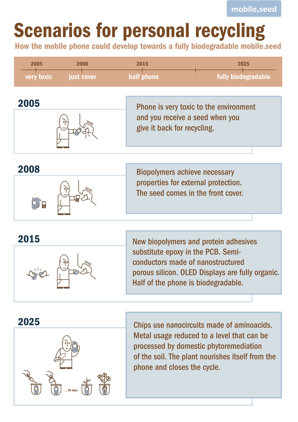 This project is a communication of a future scenario where objects could motivate users to engage in an ecological ideology without need to renounce the consumer society's acquired benefits. Mobile.Seed is a redesign of the end-of-life of a mobile phone and an exploration on the possible changes in the relationship between the consumer and the device.